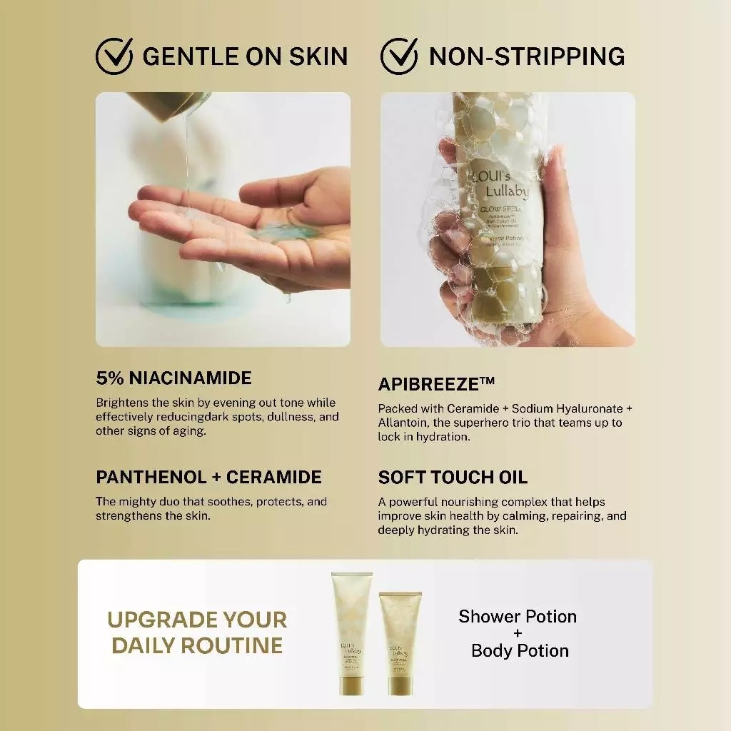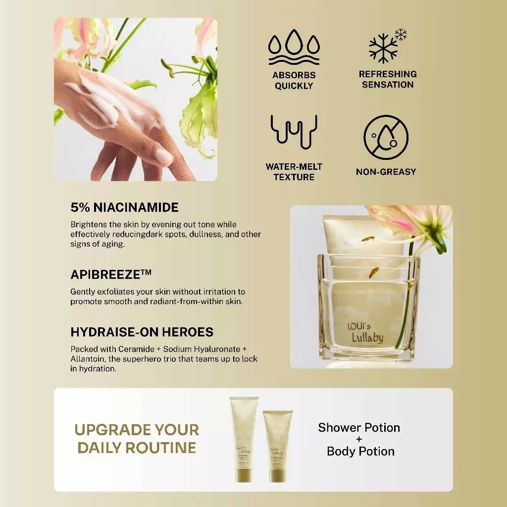 The gentle breeze on the meadow holds the serenity and wisdom of the blooming flowers. Each flowing petal carries a sense of hope, and each fluttering leaf a dream. Tender sunlight grazes your skin lovingly as butterflies dance among a cluster of bright verbena. With a delicate whisk of rose and peony, Loui’s Lullaby Body Potion lulls your skin to solace and envelops you with lingering warmth.