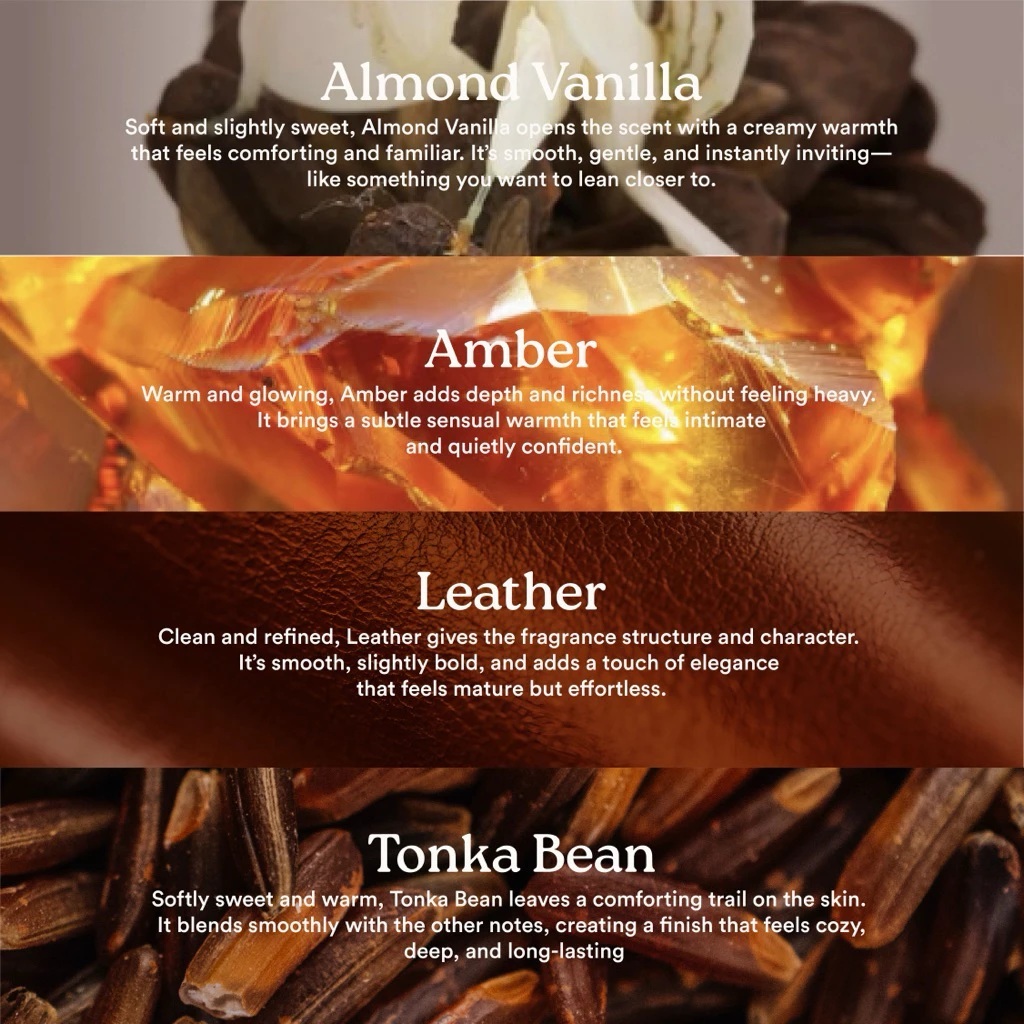 Base Notes: Finally, Tonka Bean, Amber Glow, and Creamy Leather create a velvet-rich trail, smooth and skin-like, leaving behind a sensual memory that lingers.